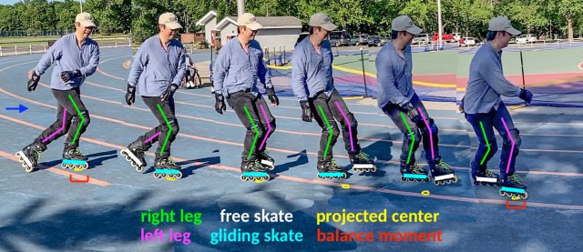 The above filmstrip is from the article Inline skating as rhythmic falls and recoveries. It uses a different set of annotation colors which are different from how this article annotates filmstrips.