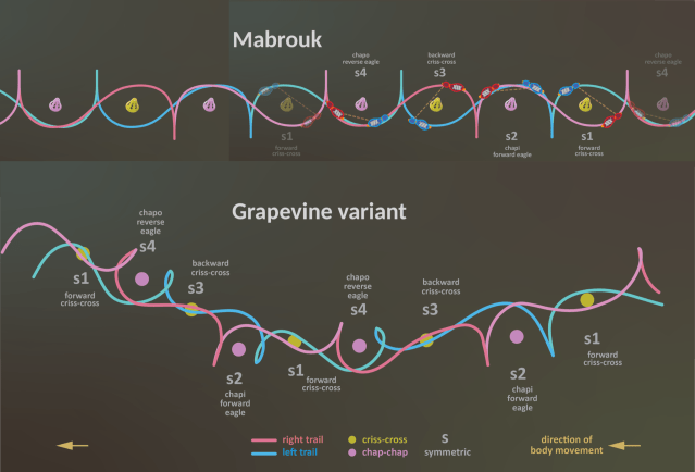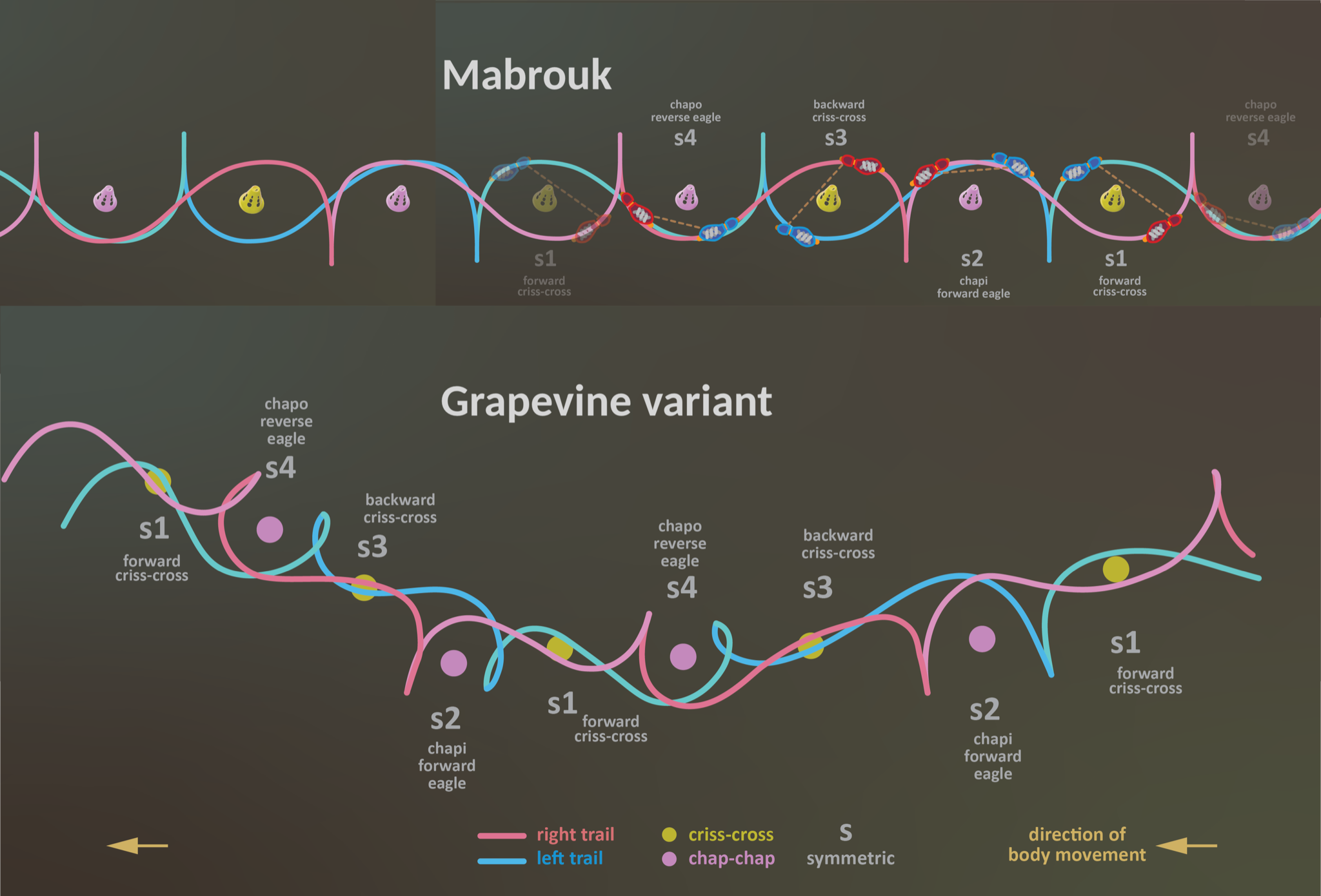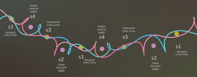 Following is a filmstrip showing the four slalom components of Mabrouk, from right to left: forward criss-cross, chapi – forward eagle, backward criss-cross, and chapo – reverse eagle. The cycle then repeats. In the film strip, components are identified by labels s1 through s4, where “s” stands for symmetric distribution points. But you can also think “slalom” component. Don’t worry too much about symmetric distribution points for now. I will talk about these later.