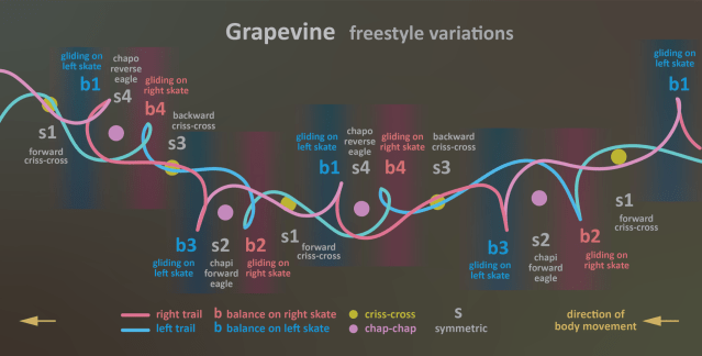 I have previously written much about Grapevine already. I started by trying to learn the ice skate version Grapevine, even before I could skate much. That journey was documented in Learn to Skate the Two-foot Grapevine Analytically. But I never quite managed to sustain the move indefinitely on ice, even though I understood intellectually how it would be done. I subsequently tried to skate Grapevine on inline skates. This turned out to be even more difficult, due to much stronger friction between wheels and pavement, compounded by my unfinished Grapevine training. However, instructions from Naomi Grigg on toe pivots and heel pivots proved to be enlightening, as I recounted in Learn the Two-foot Grapevine on Inline Skates. While I still couldn’t sustain Grapevine indefinitely on pavement, I was finally able to do so on ice by applying these pivots.