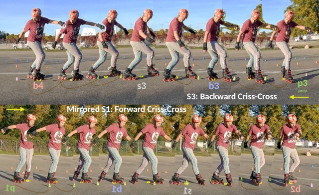 You may also contrast both simple and full instructions for s3 to those of s1. Even the instructions are mirrored versions. Specifically, the instructions are forward-backward mirrored. The left skate and the right skate play the same roles in the two components. In both components, the two skates cross over each other at the beginning of the step, and uncross at the end of the step. In both components, the two skates straddle a yellow cone at a symmetric distribution point (s3 in the third component). The only difference between the two components is the reversed direction of skates in component s3.