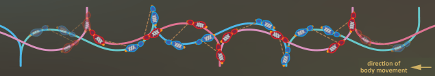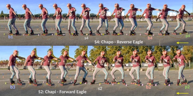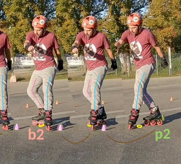 However, the right skate and the left skate plays identical roles in these two opposite moves. Track the right leg marked with red lines in both filmstrip, following the direction of the yellow arrow. Note how the right skate glides from p4 (or p2) through b4 (or b2). The right skate then spins around a pink cone, passing through s4 (or s2). The right skate is subsequently driven sideways until it can no longer glide, and remains parked immobile until b1 (or b3). Now, track the left leg instead which is marked with blue lines. The left leg and the left skate start at p4 (or p2) immobile. In both filmstrips, the left skate is used as leverage to move the right skate from p4 (or p2) to b4 (or b2). Shortly after, the left skate is pulled by the moving body, to glide and spin around a pink cone. It continues gliding even after the spin ends, and becomes the weight-bearing skate, as the skater transitions into the next slalom component at b1 (or b3).