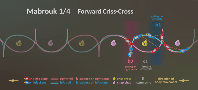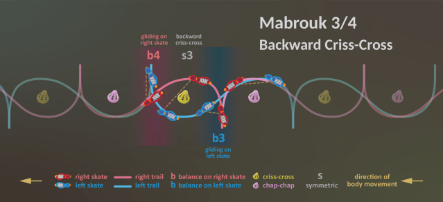 Many skating moves can help you master this first component of Mabrouk. You can start by learning the plain criss-cross. Also watch this one on lemon cross. But that is only a part of this first component. Equally important are the entrance transition from the fourth component into the first component, and the exit transition out the first component into the second component.