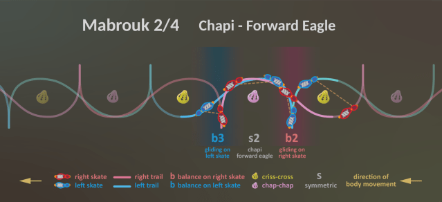Following is a filmstrip showing the four slalom components of Mabrouk, from right to left: forward criss-cross, chapi – forward eagle, backward criss-cross, and chapo – reverse eagle. The cycle then repeats. In the filmstrip, components are identified by labels s1 through s4, where “s” stands for symmetric distribution points, or if you prefer, “slalom” component.