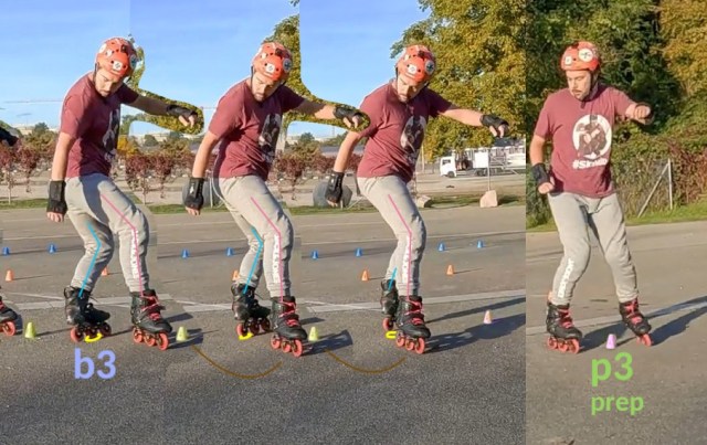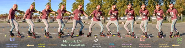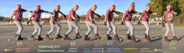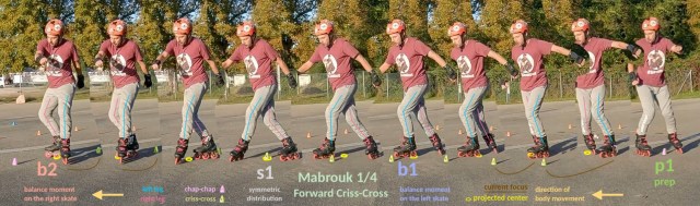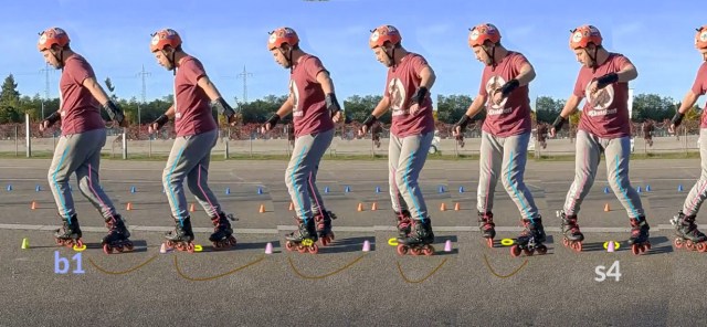 Similarly, the filmstrip above illustrates a full Mabrouk sequence, incorporating both slalom components s1, s2, s3 and s4, and balance moments b1, b2, b3 and b4. Remember to read them from right to left, as indicated by the yellow arrow showing the direction of body movement. At every component and moment, the projected center of gravity is indicated by a yellow circle on the ground. Slalom components are labeled in white – they are symmetric distribution points where both skates shoulder body weight equally. Balance moments are transition steps where one skate shoulders all body weight, colored blue when the left skate carries body weight and glides, and red when the right skate does so.