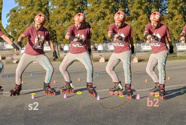 Following is a slow-motion clip showing one cycle of these four slalom components. The clip loops automatically by default. Focus on the cones, and how the two skates go around them. Identify the four symmetric distribution points s1, s2, s3 and s4 in this video.