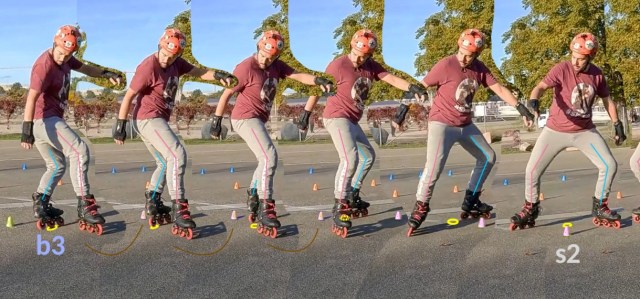 Following diagram and filmstrip recap key takeaways from part 1. Remember to read them from right to left, as indicated by the yellow arrow showing the direction of body movement. Labels s1, s2, s3 and s4 denote the four slalom components of Mabrouk. Transitions are annotated by balance moments b1, b2, b3 and b4. Vertical blue and pink bands show when left and right skates glide alone as the primary bearer of body weight. Thus, the blue left skate can be seen bearing weight and gliding around balance moments b1, and later around balance moment b3. The red right skate can be seen bearing weight and gliding around b2, and later around b4.
