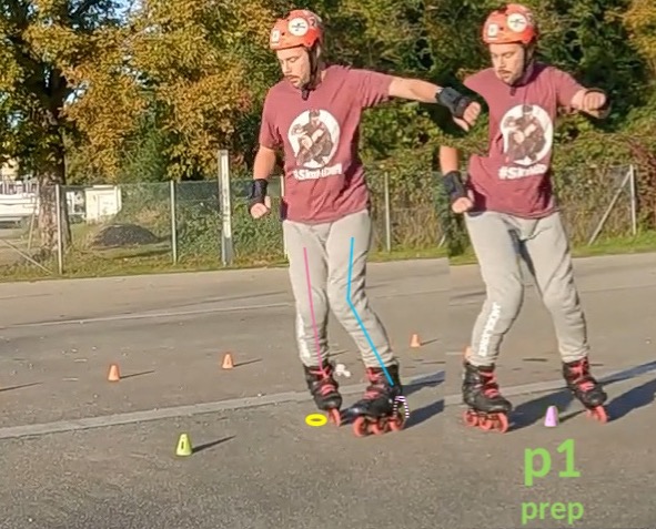 The picture above shows a skater standing with equal balance on both skates at p1. He forcefully turns his upper body clockwise to look at the yellow cone which will be his immediate target. This torso turn causes his hip to turn clockwise as well. And the hip swings the left leg, and thus the left skate clockwise, bringing the left skate to point at the yellow cone. At this point, his projected center is now outside both skates, as indicated by a yellow circle. The skater is intentionally falling towards the yellow cone. If he does not move his skates to eventually catch his fall, he will topple forward onto the cone.