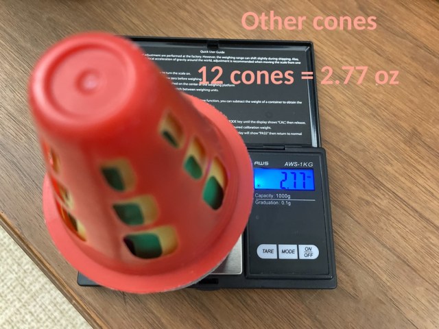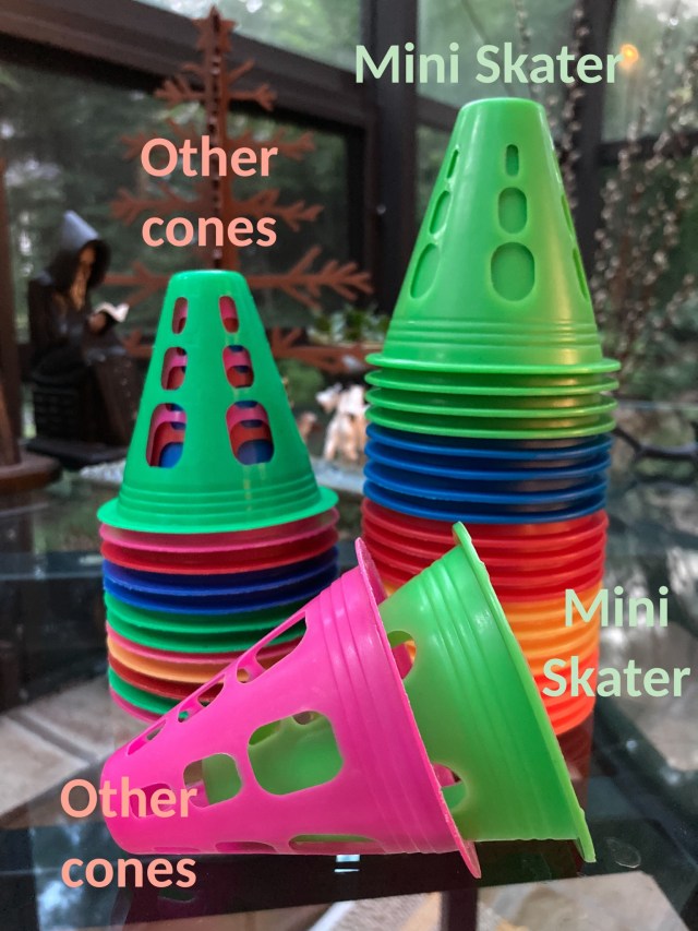 But in the beginning, cones may be a nuisance before you learn to slalom properly. When I first started, I kept knocking cones off at every move. When it’s windy, cones are blown off spontaneously, all the time. Let’s address the easy part first. Get thick and heavy slalom cones, like the cones from Mini Skater, shown below. They are thicker than everything else on Amazon, and are twice as heavy. Even then, I still need to stack two cones at every spot on a windy day, so they don’t fly off.