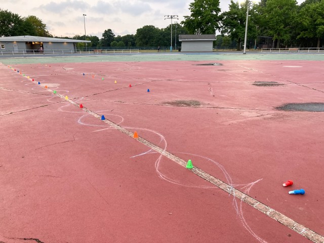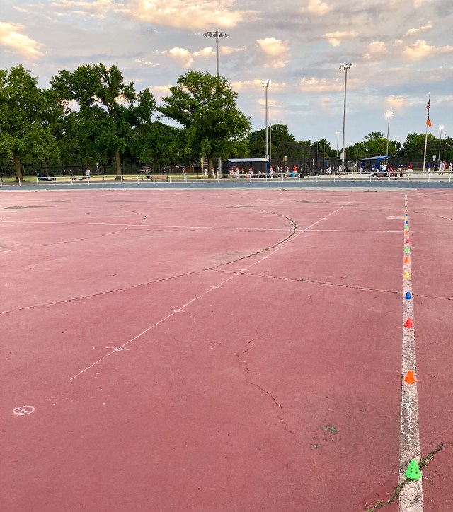 The wheelchair baseball court at Eisenhower Park is lit up at night, when adjacent baseball courts are in use. This is great because the park is too hot under the midsummer sun during the day. I take advantage of white boundary lines to lay down cones in a straight line.
