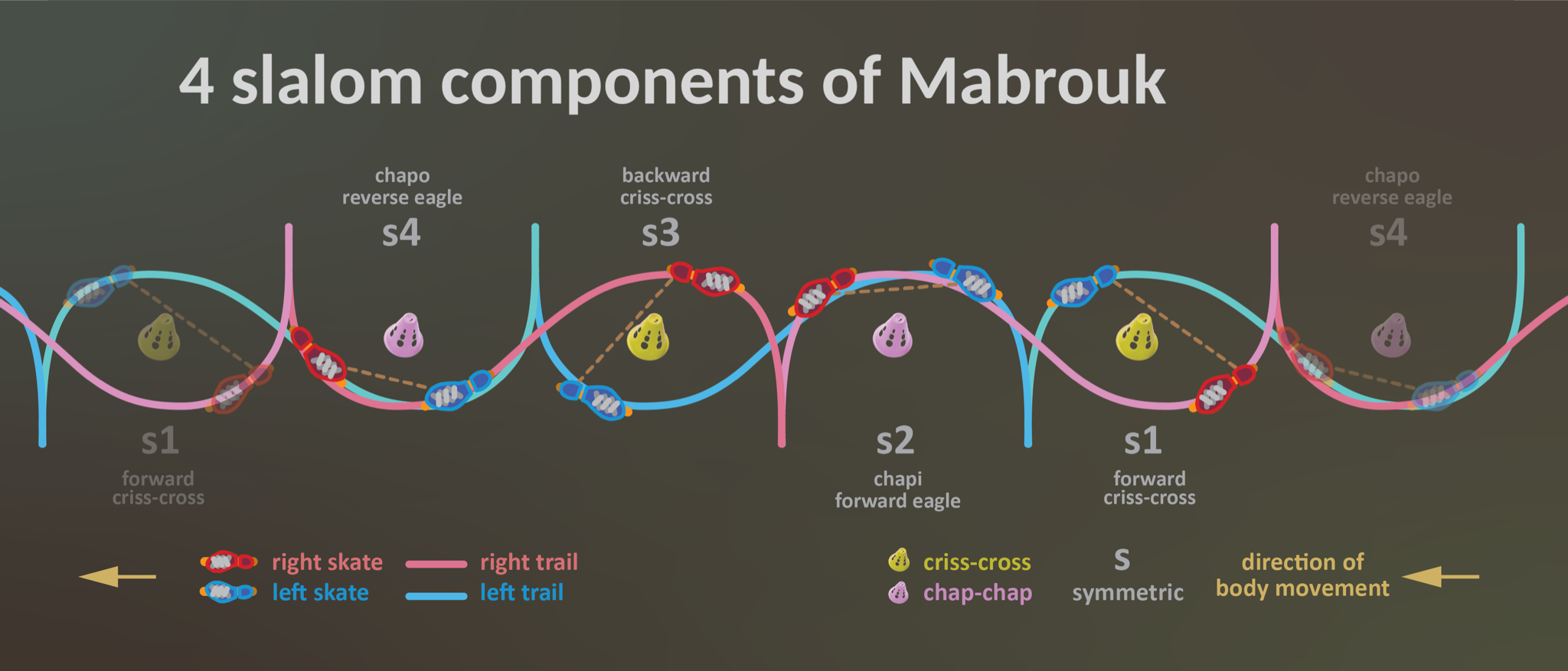 This is part 2 of a series on Mabrouk. In this part I describe in excruciating details the four slalom components of Mabrouk previously summarized in What is Mabrouk: a slalom variant of Grapevine. I learned to skate a sustained Mabrouk by first practicing the four slalom components, and by connecting them with rudimentary transitions. I later refined these transitions to make the entire Mabrouk sequence flow, but that is for part 3 and beyond of this series.