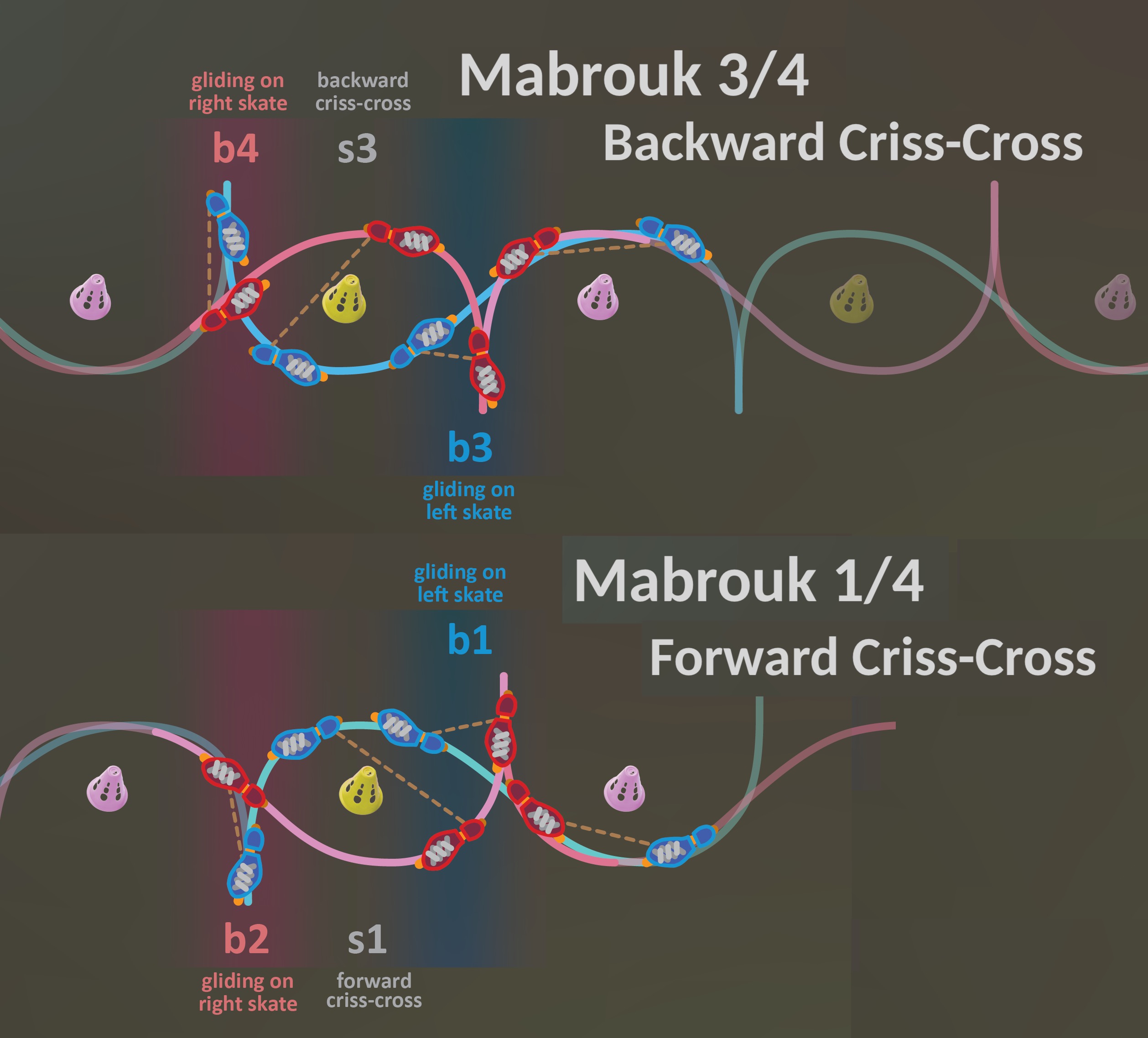 Many skating moves can help you master this first component of Mabrouk. You can start by learning the plain criss-cross. Also watch this one on lemon cross. But that is only a part of this first component. Equally important are the entrance transition from the fourth component into the first component, and the exit transition out the first component into the second component.