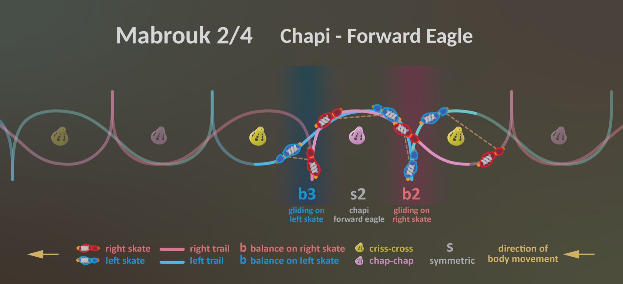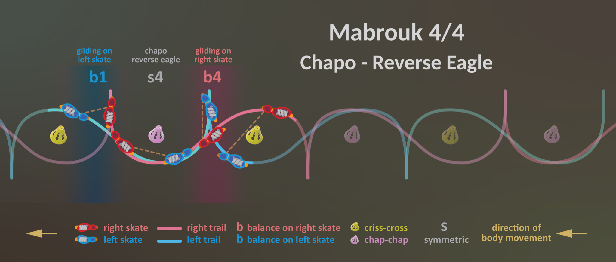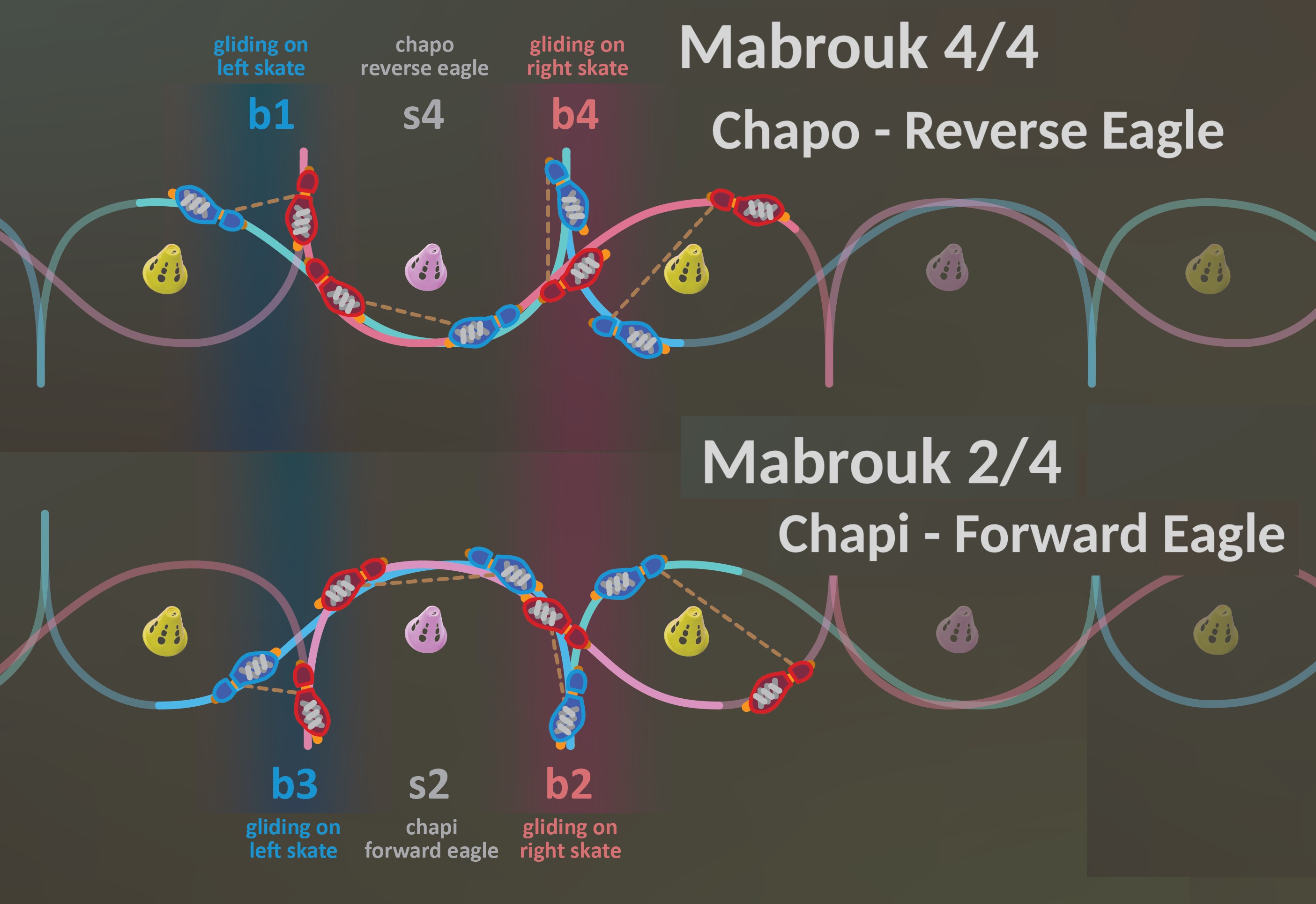 Following is a filmstrip showing the four slalom components of Mabrouk, from right to left: forward criss-cross, chapi – forward eagle, backward criss-cross, and chapo – reverse eagle. The cycle then repeats. In the filmstrip, components are identified by labels s1 through s4, where “s” stands for symmetric distribution points, or if you prefer, “slalom” component.