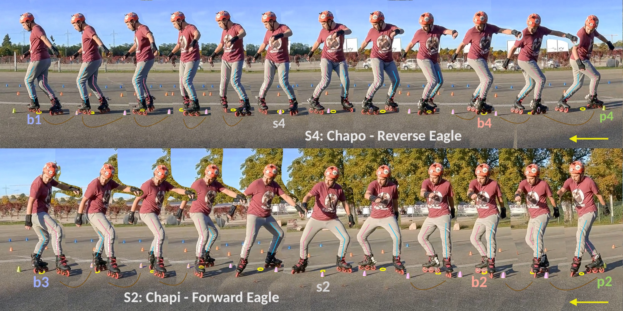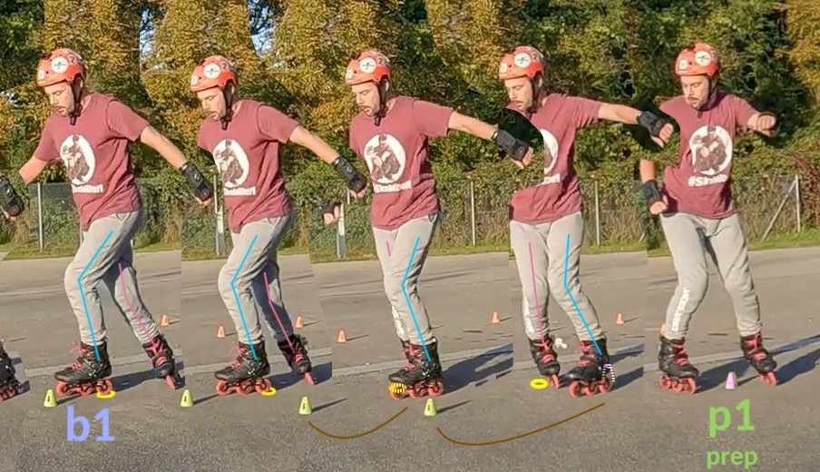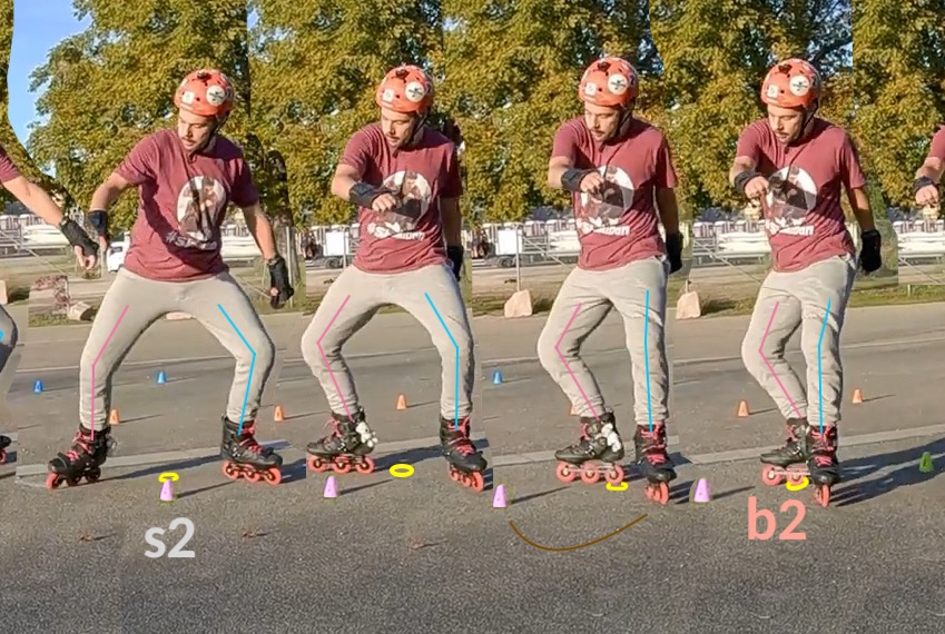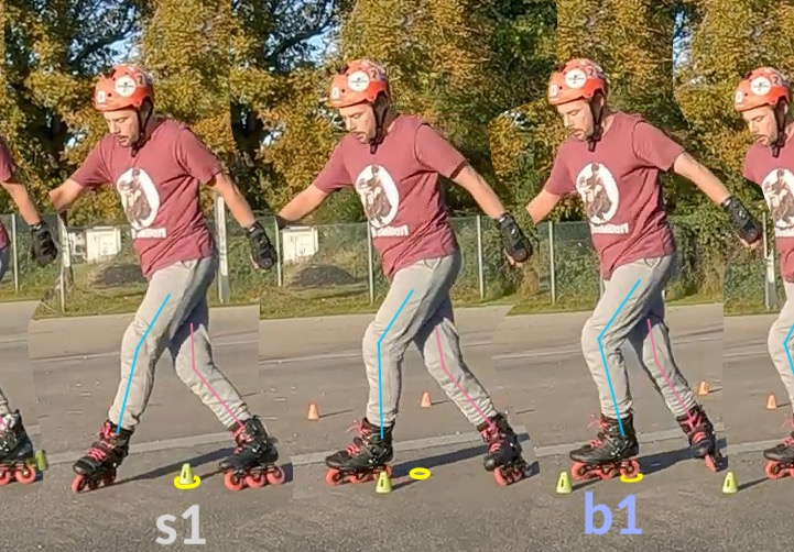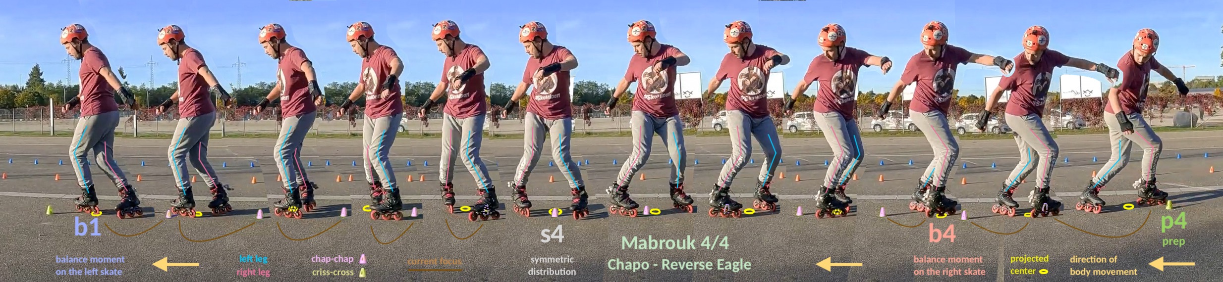 Similarly, the filmstrip above illustrates a full Mabrouk sequence, incorporating both slalom components s1, s2, s3 and s4, and balance moments b1, b2, b3 and b4. Remember to read them from right to left, as indicated by the yellow arrow showing the direction of body movement. At every component and moment, the projected center of gravity is indicated by a yellow circle on the ground. Slalom components are labeled in white – they are symmetric distribution points where both skates shoulder body weight equally. Balance moments are transition steps where one skate shoulders all body weight, colored blue when the left skate carries body weight and glides, and red when the right skate does so.