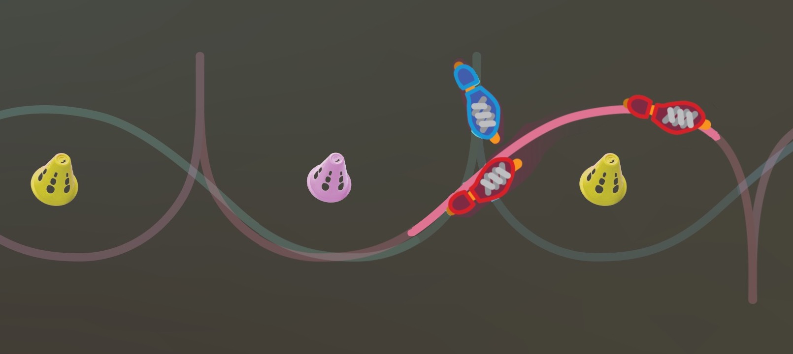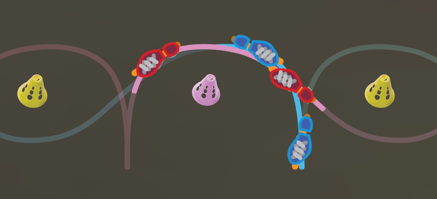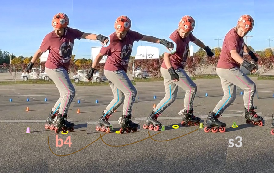 Following diagram and filmstrip recap key takeaways from part 1. Remember to read them from right to left, as indicated by the yellow arrow showing the direction of body movement. Labels s1, s2, s3 and s4 denote the four slalom components of Mabrouk. Transitions are annotated by balance moments b1, b2, b3 and b4. Vertical blue and pink bands show when left and right skates glide alone as the primary bearer of body weight. Thus, the blue left skate can be seen bearing weight and gliding around balance moments b1, and later around balance moment b3. The red right skate can be seen bearing weight and gliding around b2, and later around b4.