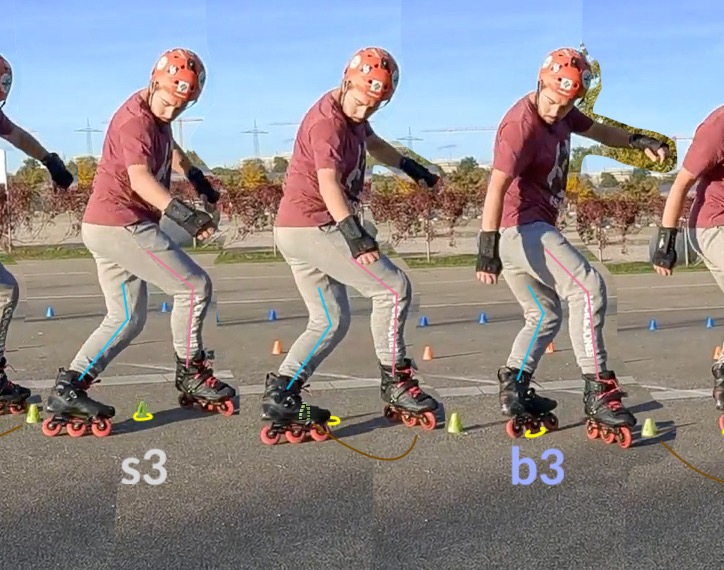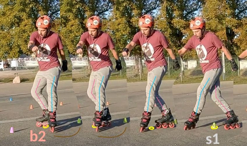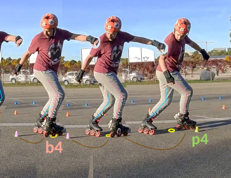 However, the right skate and the left skate plays identical roles in these two opposite moves. Track the right leg marked with red lines in both filmstrip, following the direction of the yellow arrow. Note how the right skate glides from p4 (or p2) through b4 (or b2). The right skate then spins around a pink cone, passing through s4 (or s2). The right skate is subsequently driven sideways until it can no longer glide, and remains parked immobile until b1 (or b3). Now, track the left leg instead which is marked with blue lines. The left leg and the left skate start at p4 (or p2) immobile. In both filmstrips, the left skate is used as leverage to move the right skate from p4 (or p2) to b4 (or b2). Shortly after, the left skate is pulled by the moving body, to glide and spin around a pink cone. It continues gliding even after the spin ends, and becomes the weight-bearing skate, as the skater transitions into the next slalom component at b1 (or b3).