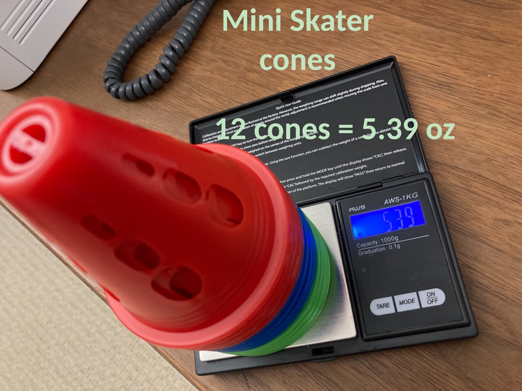 But in the beginning, cones may be a nuisance before you learn to slalom properly. When I first started, I kept knocking cones off at every move. When it’s windy, cones are blown off spontaneously, all the time. Let’s address the easy part first. Get thick and heavy slalom cones, like the cones from Mini Skater, shown below. They are thicker than everything else on Amazon, and are twice as heavy. Even then, I still need to stack two cones at every spot on a windy day, so they don’t fly off.