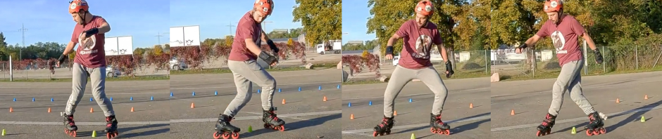 The simple instructions begin with stance p1, for preparation step 1. This stance is actually not a part of the first criss-cross component. It is in fact the last part of the fourth component, the reverse eagle. To practice a component, the skater needs to start with a setup that is a part of the previous component. Using a previous component as a prep step helps you learn to eventually string the 4 components into a single flow. As you will see later, all prep steps of the four components set up the skater “to fall”. See the article Inline skating as rhythmic falls and recoveries for terminology on falls and recoveries. This “fall” is a key part of a transition from one component to the next component, making the move a Mabrouk move.