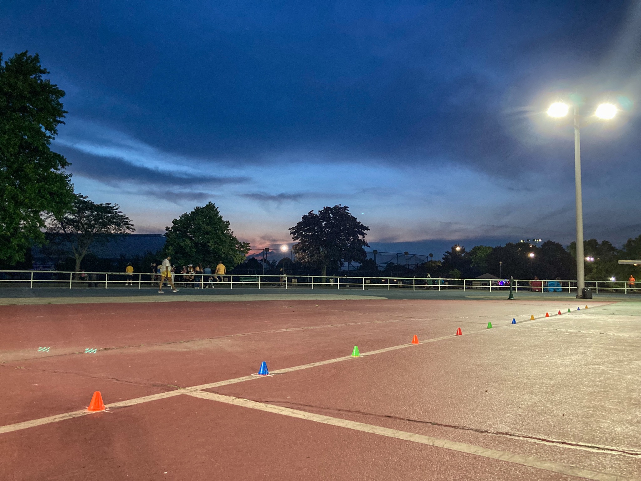 The wheelchair baseball court at Eisenhower Park is lit up at night, when adjacent baseball courts are in use. This is great because the park is too hot under the midsummer sun during the day. I take advantage of white boundary lines to lay down cones in a straight line.