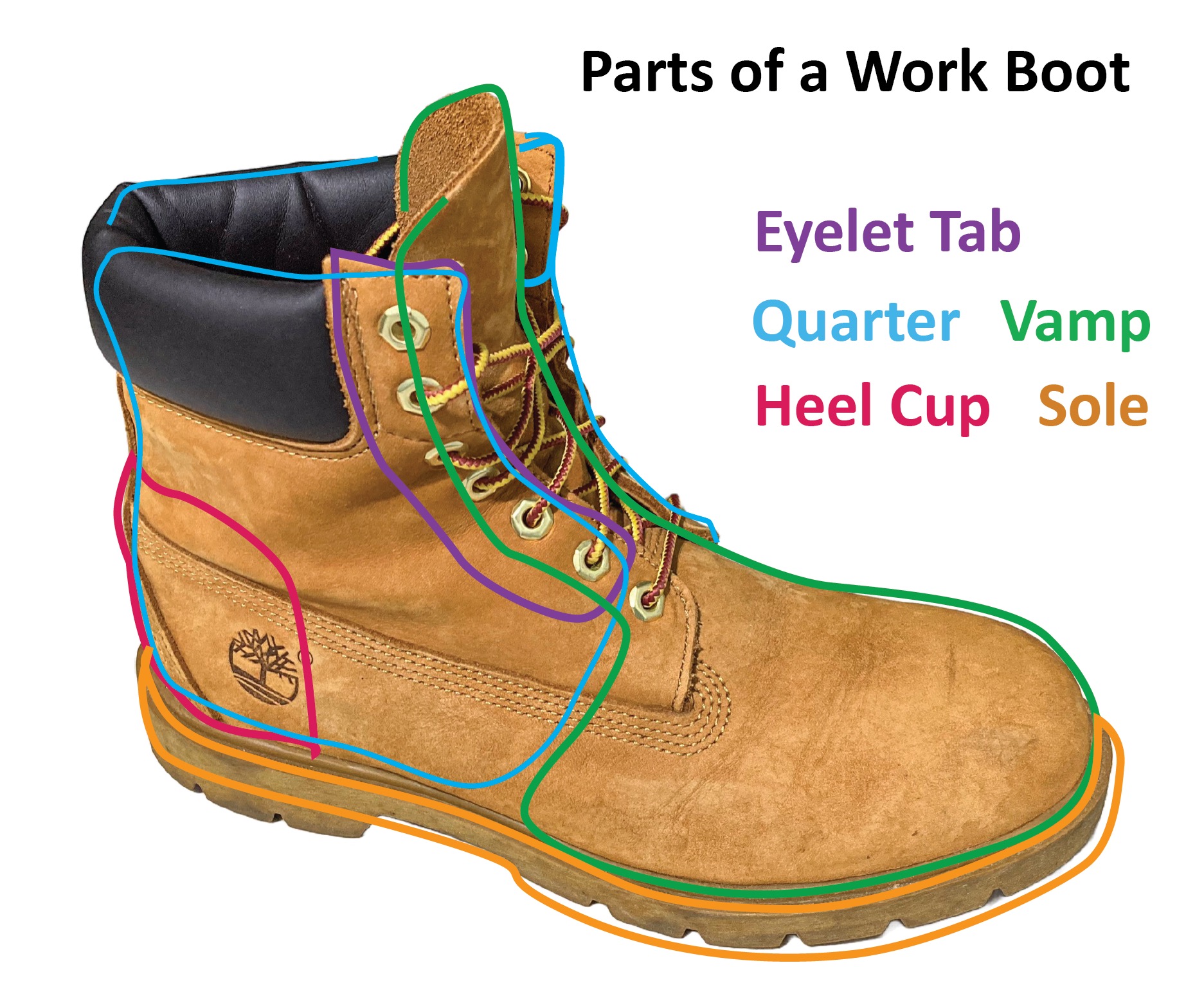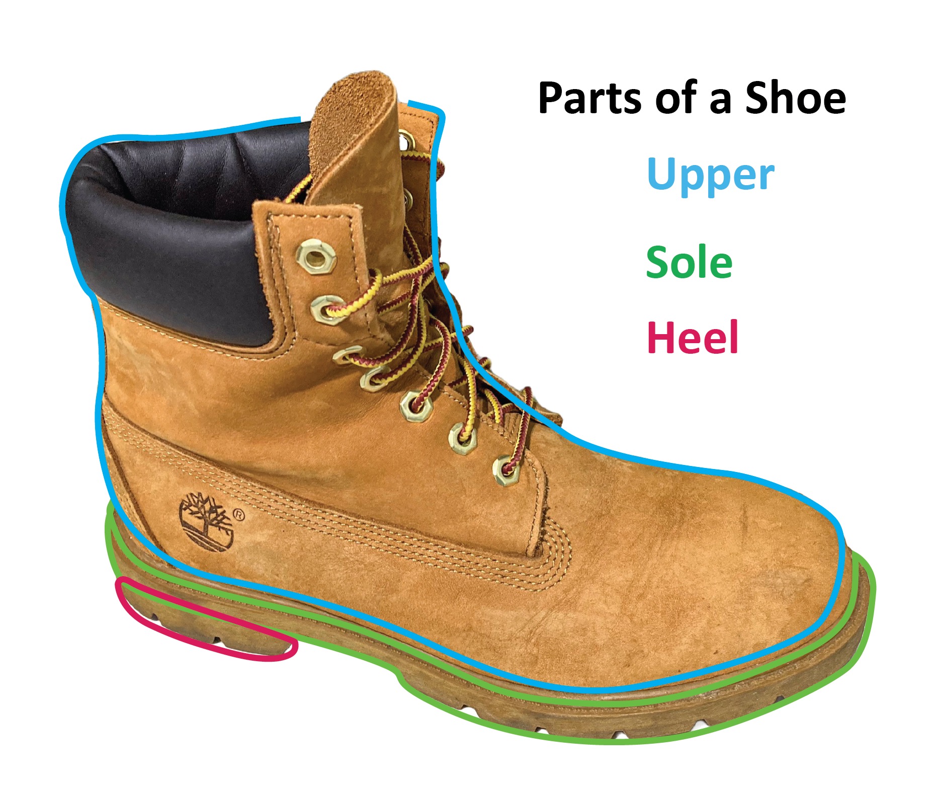 Skate boots are clearly inspired by shoes which people have been making for millenniums. Both are made by similar processes, and share common terminology for naming components. In general, there are two main parts to a shoe: the upper and the sole. Sometimes people refer to the heel piece touching the ground as a separate part.