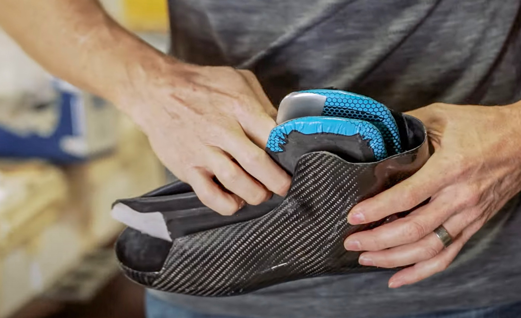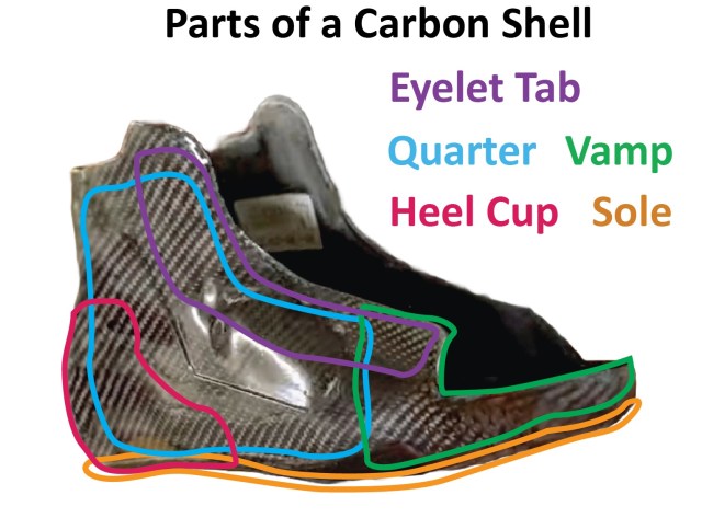 It should be evident that the one-piece carbon shell does multiple duty. It singlehandedly serves as the sole, houses the entire heel cup, forms two entire quarter panels, provides tabs for all eyelets, and surrounds the toes as side walls of the vamp.