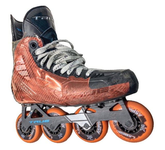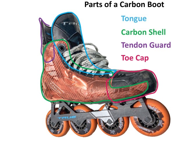 There are at least three types of carbon-fiber inline skates on the market. So far we’ve been talking about hockey-style skates, hereafter referred to as just hockey skates. Both ice hokey and street hockey share the same carbon shell construction. The picture shown bellow illustrates a typical example. This is from TRUE Hockey, and they call their one-piece carbon shell a monocoque shell, leveraging a well-known term from the car industry.