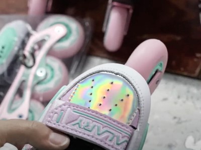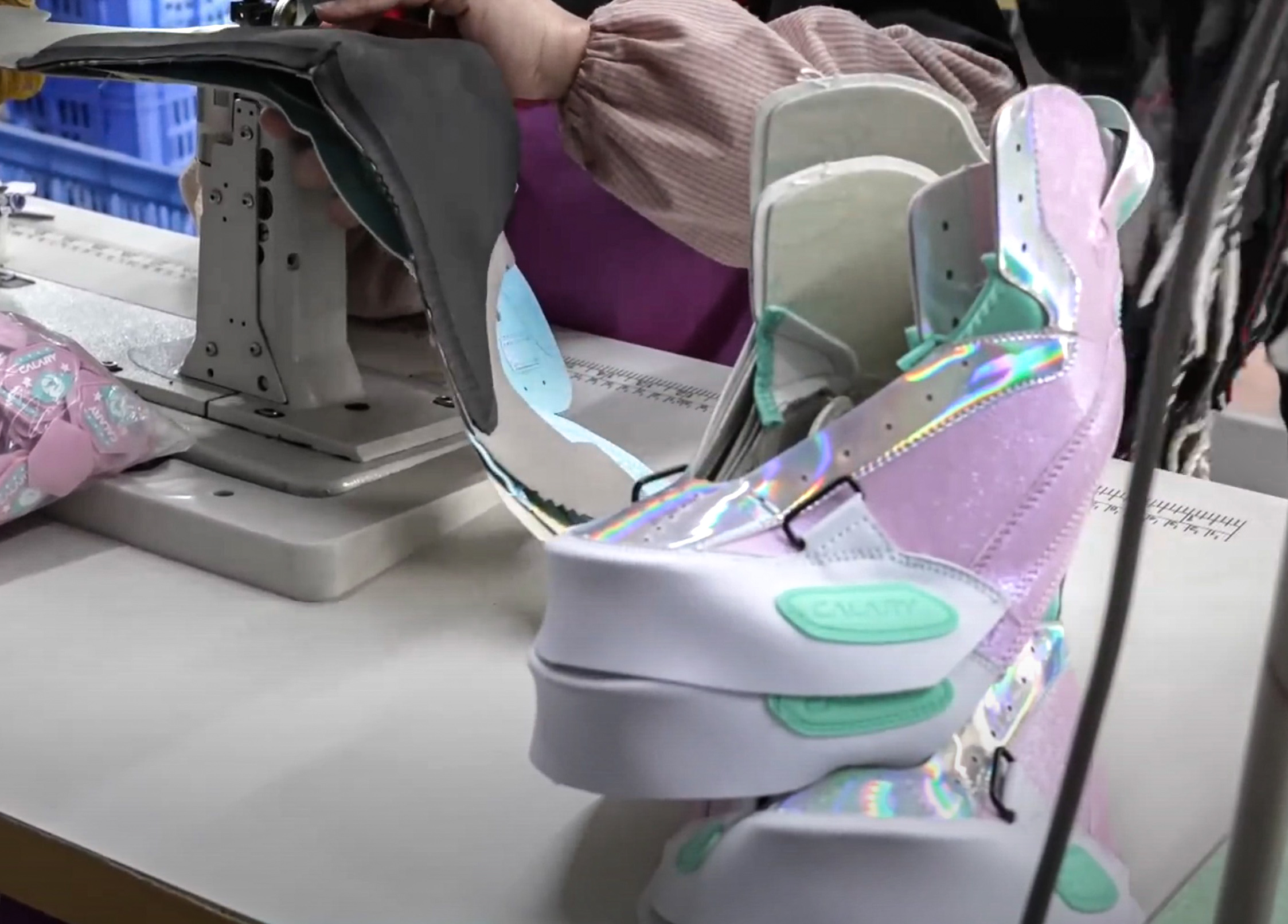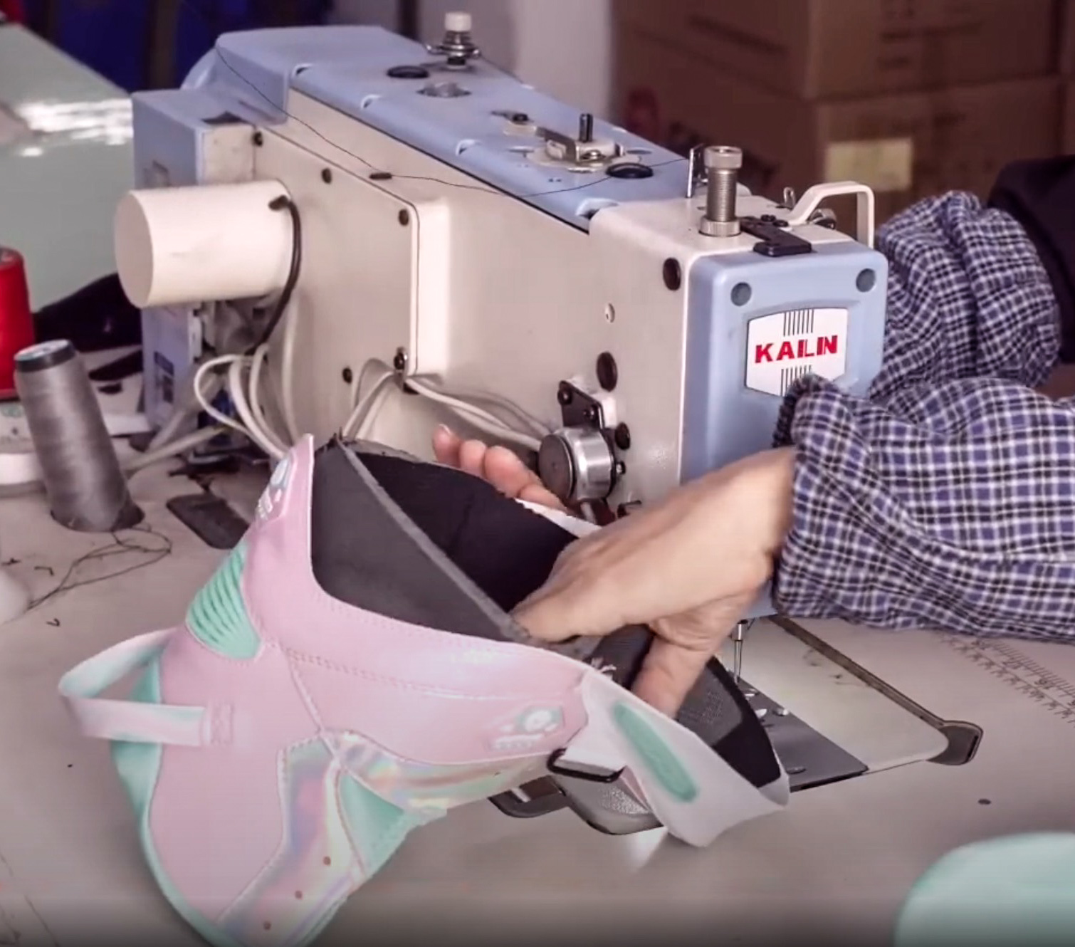 In this skate, the toe cap and decorative side panels are stitched together as a single part. This part is glued onto the one-piece shell. These parts are pressed again to form proper bonding.