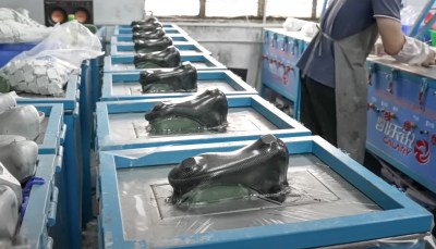 Much stretching follows. All parts of the upper are carefully stretched and measured against edges of the shell, to ensure proper fit. The toe cap area is reinforced with TPU-like materials.