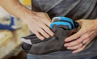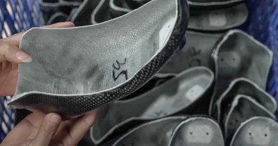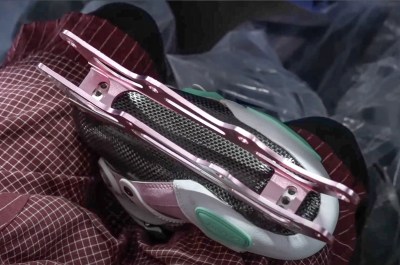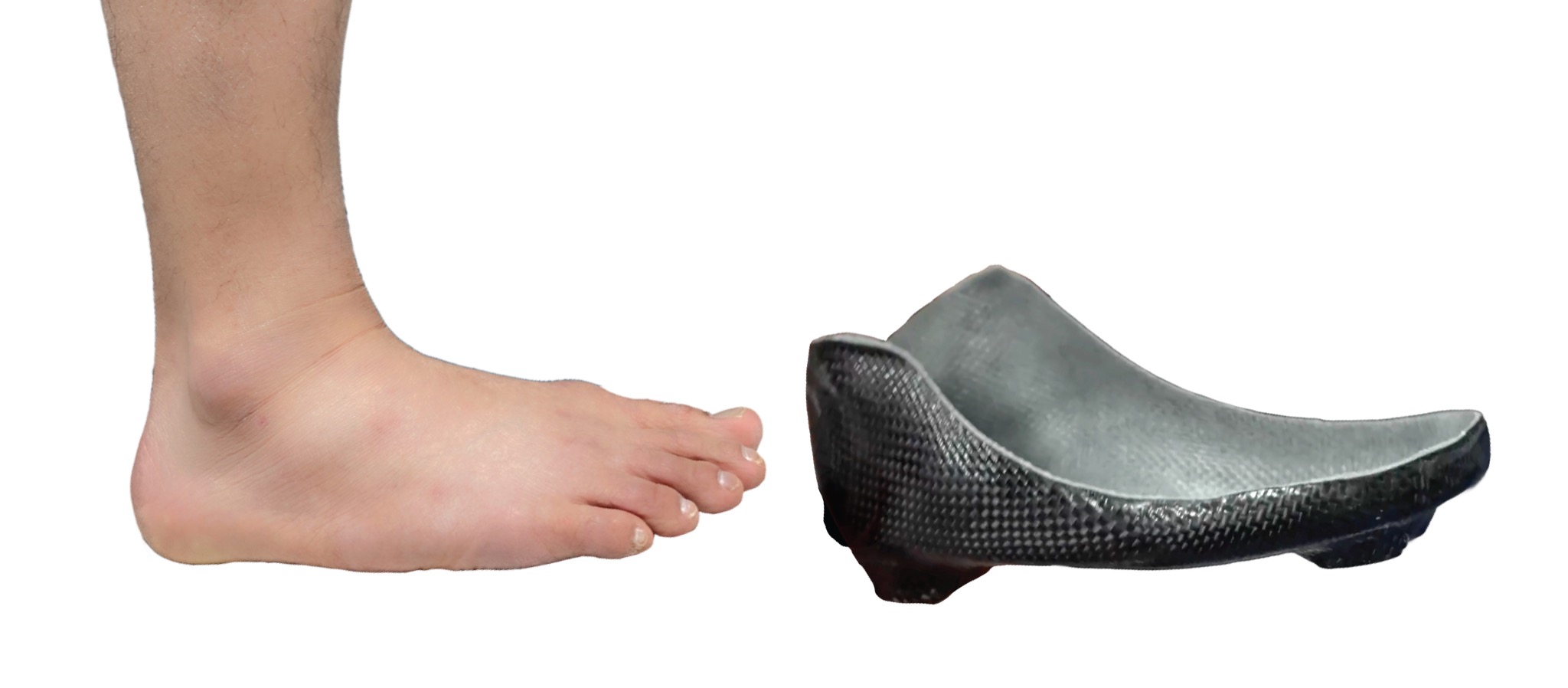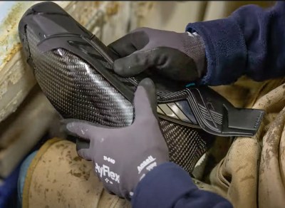 The cured carbon shell is trimmed. Note how the one-piece shell covers not just the sole and heel of a foot, but also entire ankle areas, plus eyelet tabs and lower side walls of the toe cap.