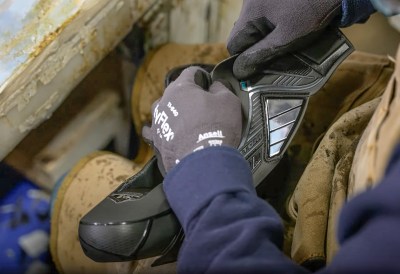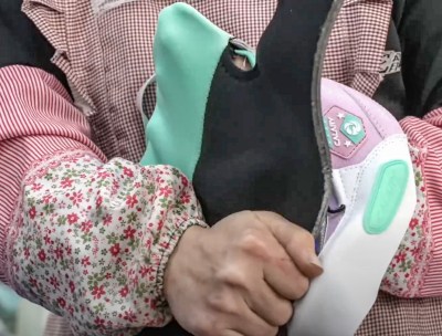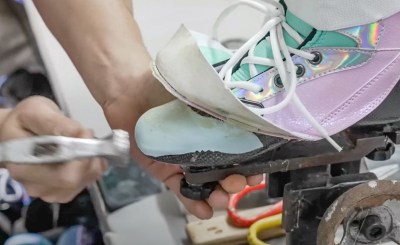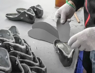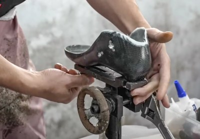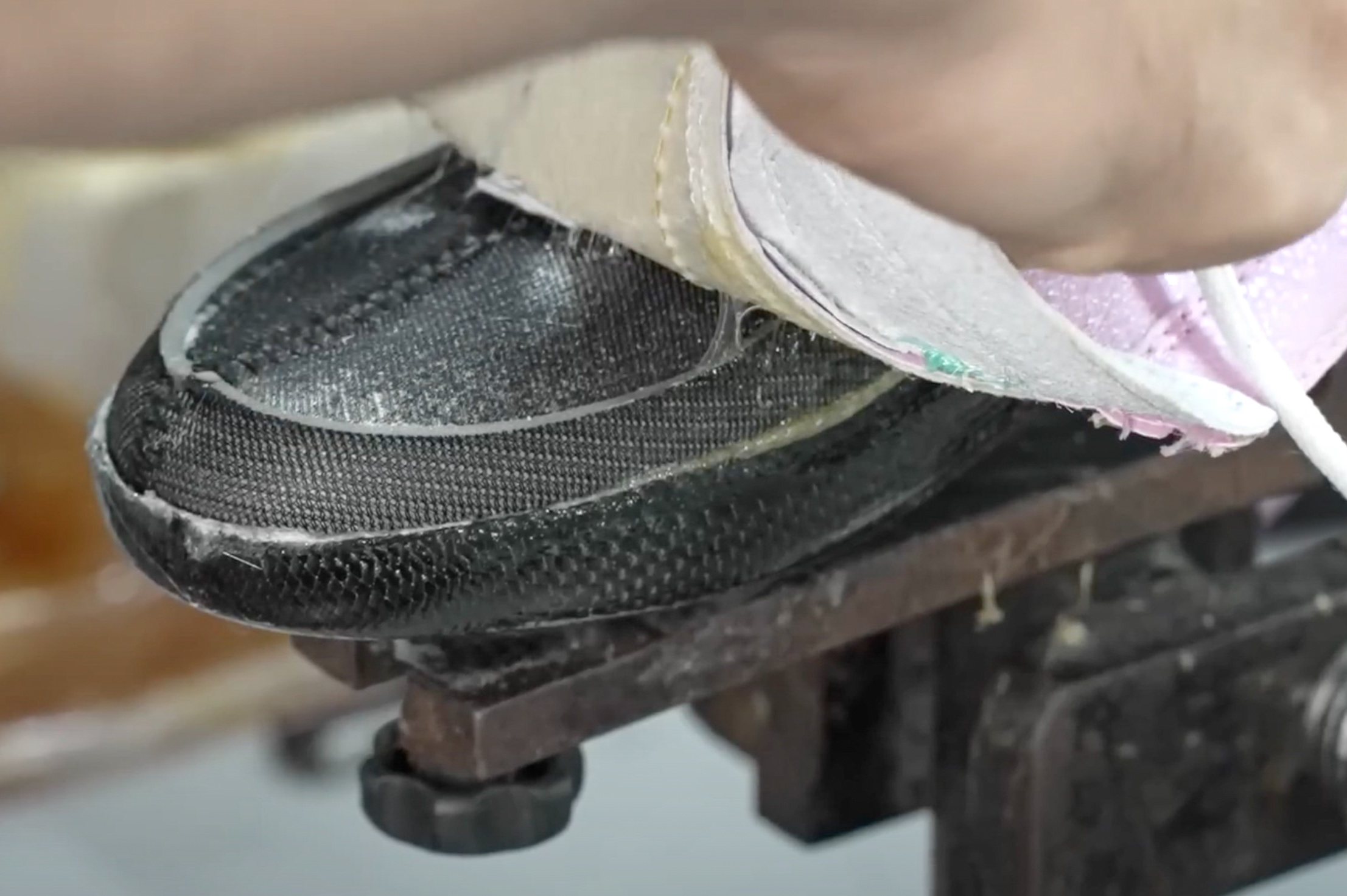 Now the upper assembly is attached to the carbon shell. This is not as simple as just gluing the insole onto the sole of the shell. Both inside and outside walls of the shell are primed with glue. Then the upper assembly is lowers onto the shell, with the integrated liner stuck to the inside walls of the shell, and the upper stuck to the outside of the shell.