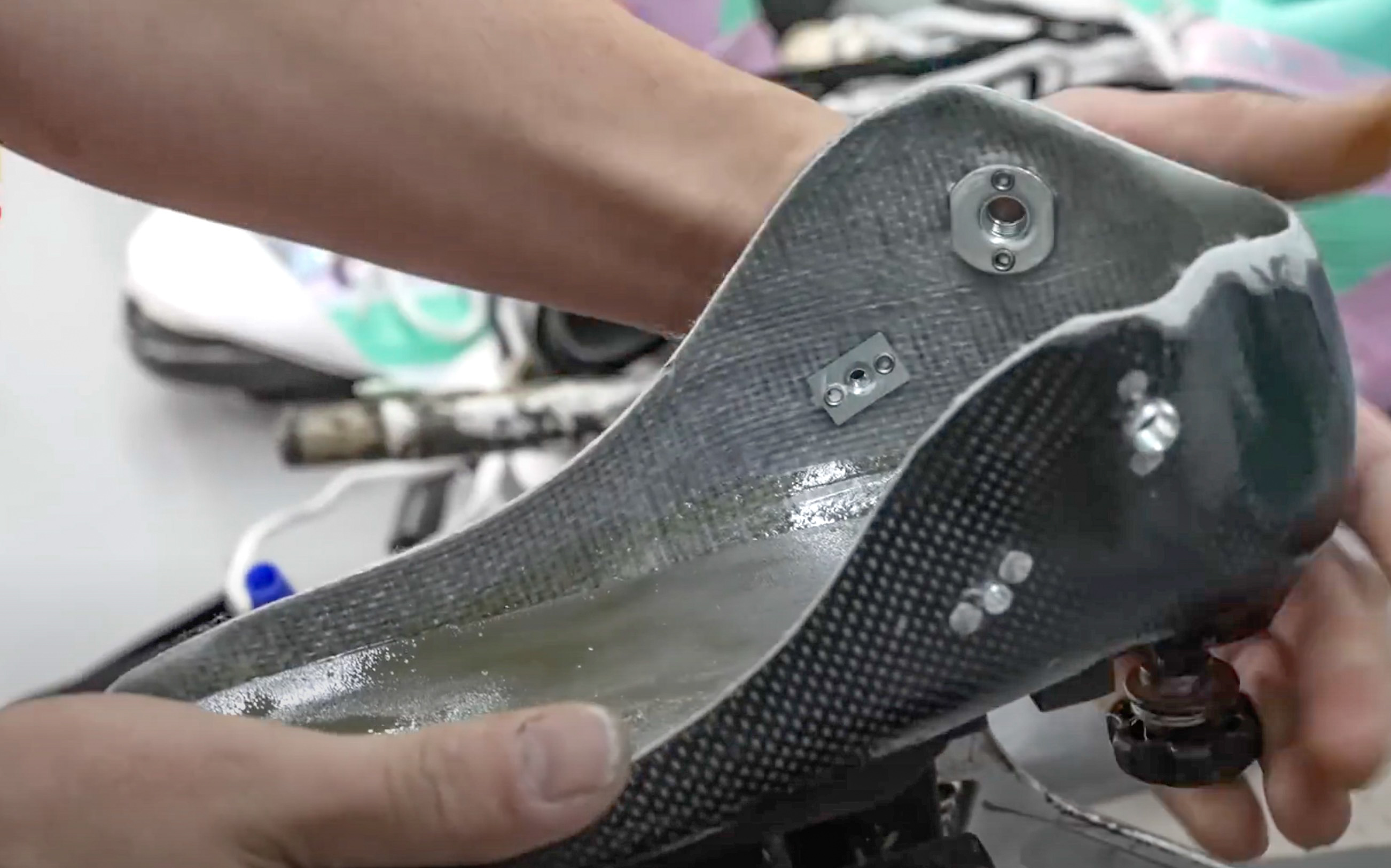 This is your foot inside a carbon urban shell. Compared to hockey skates, this carbon shell only cover the heel and the sole. By itself this shell can’t lock your foot in it. Instead, the “upper” of an urban skate does the heavy lifting, and locks your foot inside the boot. This is because closure mechanisms are stitched or screwed only onto the upper, and not to the carbon shell.