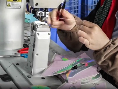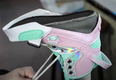 The tongue is stitched in. And the boot is laced up. This completes the process of making a pair of carbon-fiber hockey skates.