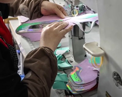 Now we have a shoe-looking upper. Note the green triangular piece of cloth that bridges a quarter part to the vamp. This cloth allows the two parts to separate from each other when a skater stands tall, and pinch together when a skater squats in an athletic stance.