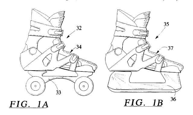 However, drawings in this patent shows some design features of urban boots that have not changed in 40 years. For instance, Olson obsessed over interchangeable ground contacts in these boots. See drawings from the 1998 patent. Then look at the Tau boot on the right, with the interchangeable Trinity Mount from Powerslide. Many urban skates now come with interchangeable wheel frames.