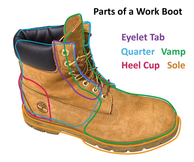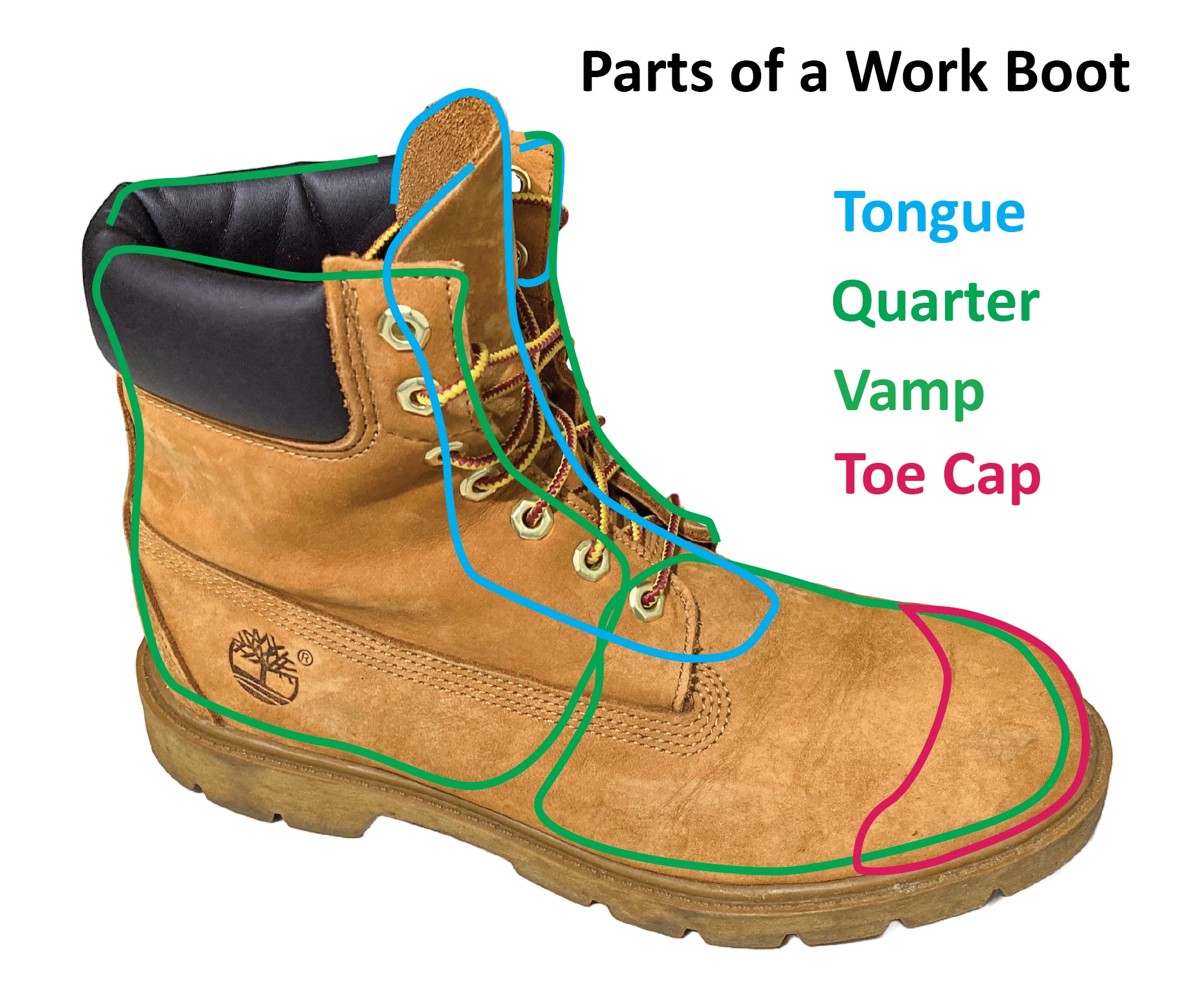 The “vamp” forms mainly the front half of the shoe. But it technically includes the tongue which covers the instep and the shin of a foot. Some eyelets may be stitched onto the vamp. There may be a toe cap as a structural reinforcement for this vulnerable area.