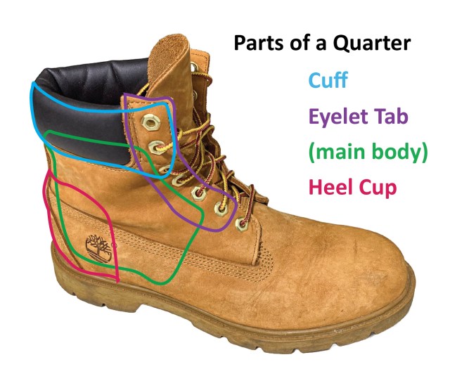 The “quarters” form the two sides and the back of the rear half of the shoe. Some components are stitched onto it, including the cuff, eyelet tabs, and a heel cup. The heel cup is a structural reinforcement to stabilize and secure the heel of a foot.