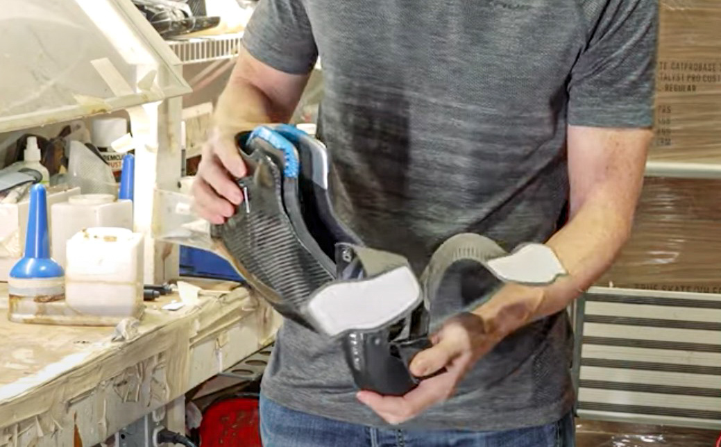 I have taken some screenshots from an excellent video from the good folks from Ice Warehouse. This is the same company as Inline Warehouse from whom I’ve been buying my inline equivalent for a while. I really like how informative their product pages are. And they also make informative videos like the one I reference. This video walks the audience through the entire production process of a pair of TRUE carbon hockey skates. Shown here are “ice” skates. But their “street” skates are done the same way, with almost the same riveting patterns on boots, but with an inline frame attached instead.