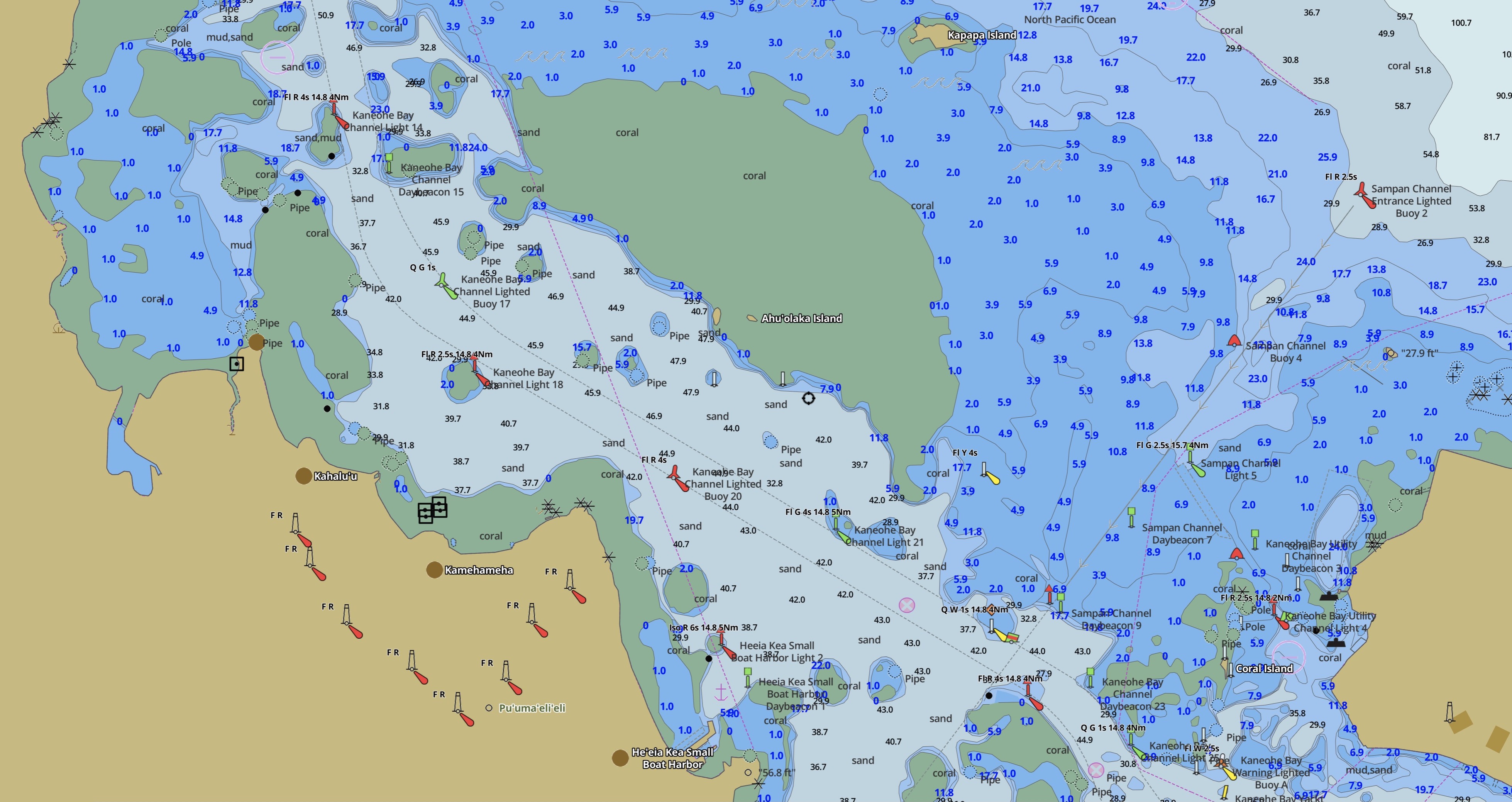 Following is a rendering of the NOAA Nautical Chart 19359, showing O‘ahu East Coast and Käne‘ohe Bay. Note that printed charts have been retired; they are no longer updated and should not actually be used for navigation. The screenshot is from an interactive version of the chart provided by GPS Nautical Charts.