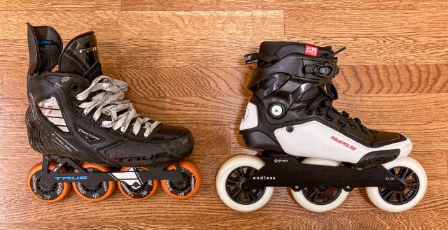 I’ve been skating for a while on inline hockey skates with four 80mm wheels. These are normal-sized wheels popular since decades ago. These skates are great for urban skating on paved streets, skating on bike trails, skating at an outdoor rink, slalom skating around cones, and doing two-foot wizard skating moves.